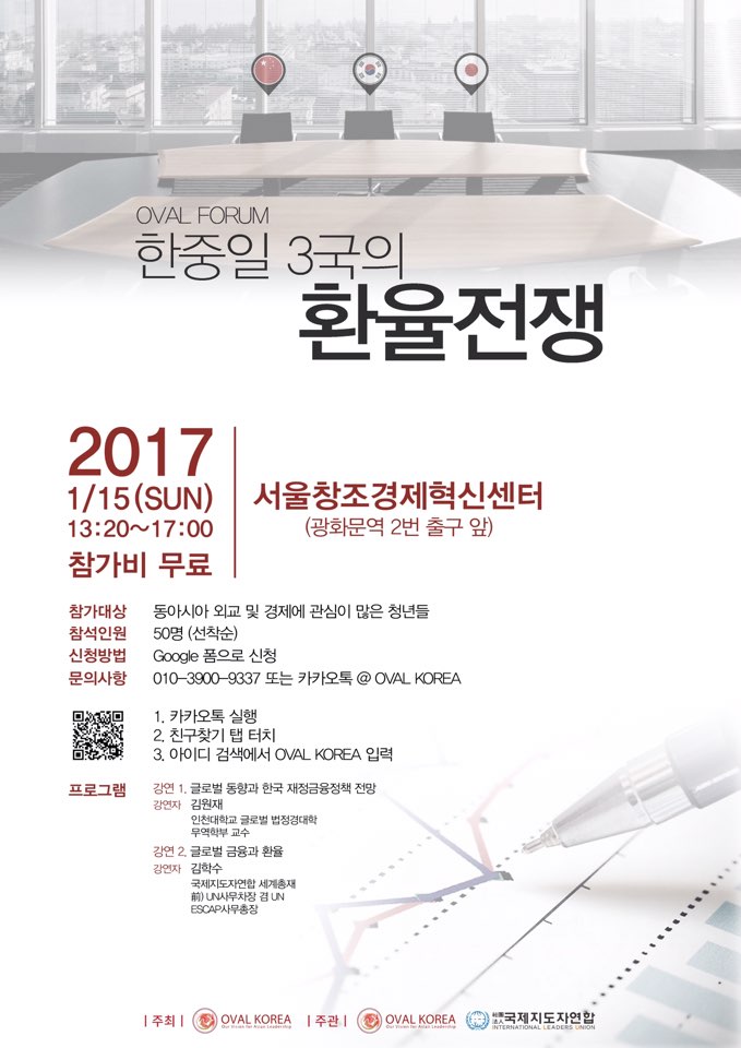 교양과 사회적 소양을 쌓을 수 있는 절호의 기회인 겨울방학을 맞아, 경제에 또는 동북아시아 3국에 관심이 많은 대학생 여러분들을 위하여 한중일 대학생 연합단체 OVAL KOREA에서 "제3회 OVAL FORUM 한중일 3국의 환율전쟁" 을 개최합니다!