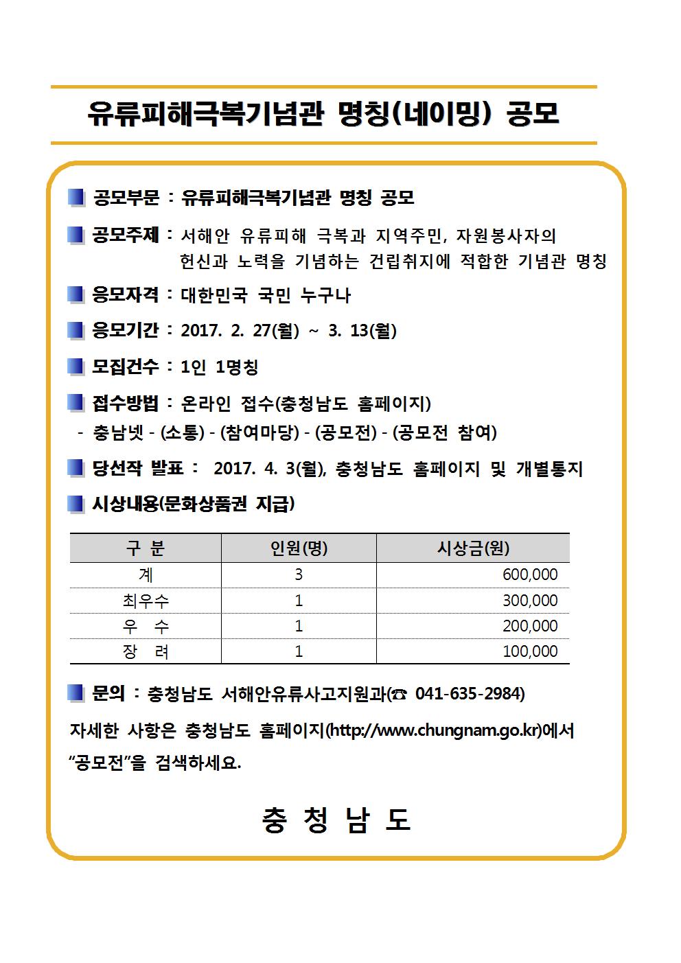 - 수상작은 충청남도 유류피해극복기념관(가칭) 관련 각종 홍보 배너, 포스터, 공문, 소식지, 행사안내문,