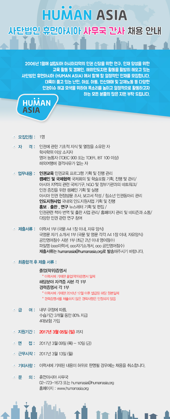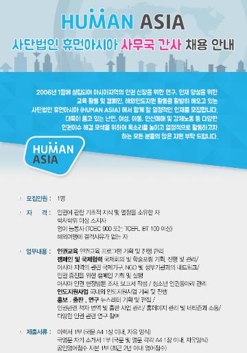 사단법인 휴먼아시아 사무국 간사 채용 안내 (~3/5)