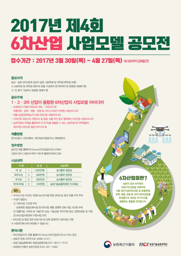 - 공고 및 신청·접수 (접수: 6차산업 사업모델 공모전 홈페이지) : 3.30-4.27