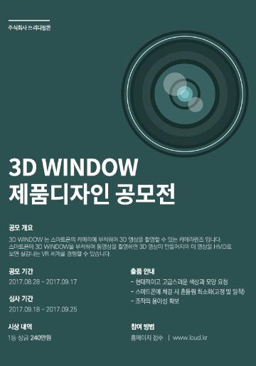 - 3D WINDOW 는 스마트폰의 카메라에 부착하여 3D 영상을 촬영할 수 있는 카메라렌즈 입니다. 스마트폰에 3D WINDOW를 부착하여 동영상을 촬영하면 3D 영상이 만들어지며 이 영상을 HMD로 보면 실감나는 VR 세계를 경험할 수 있습니다. 타겟층은 주로 청소년이라고 할 수 있으나 이에 한정하지 않습니다.