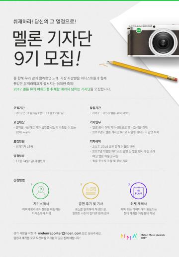 올 한해 우리 곁에 함께했던 노래, 가장 사랑받은 아티스트들과 함께 꿈같은 뮤직라이프가 펼쳐지는 성대한 축제! 2017 멜론 뮤직 어워드를 취재할 에너지 넘치는 기자단을 모집합니다.
