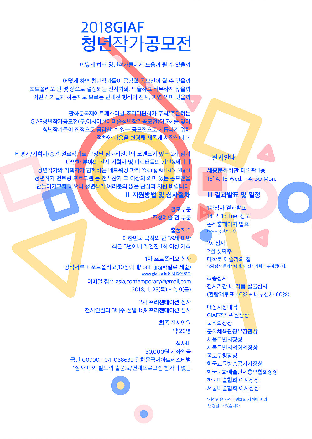 광화문국제아트페스티벌 조직위원회가 주최/주관하는 GIAF청년작가공모전(구.아시아현대미술청년자가공모전)이 7회를 맞아 청년작가들이 진정으로 공감할 수 있는 공모전으로 거듭나기 위해 절차와 내용을 변경해 새롭게 시작합니다.