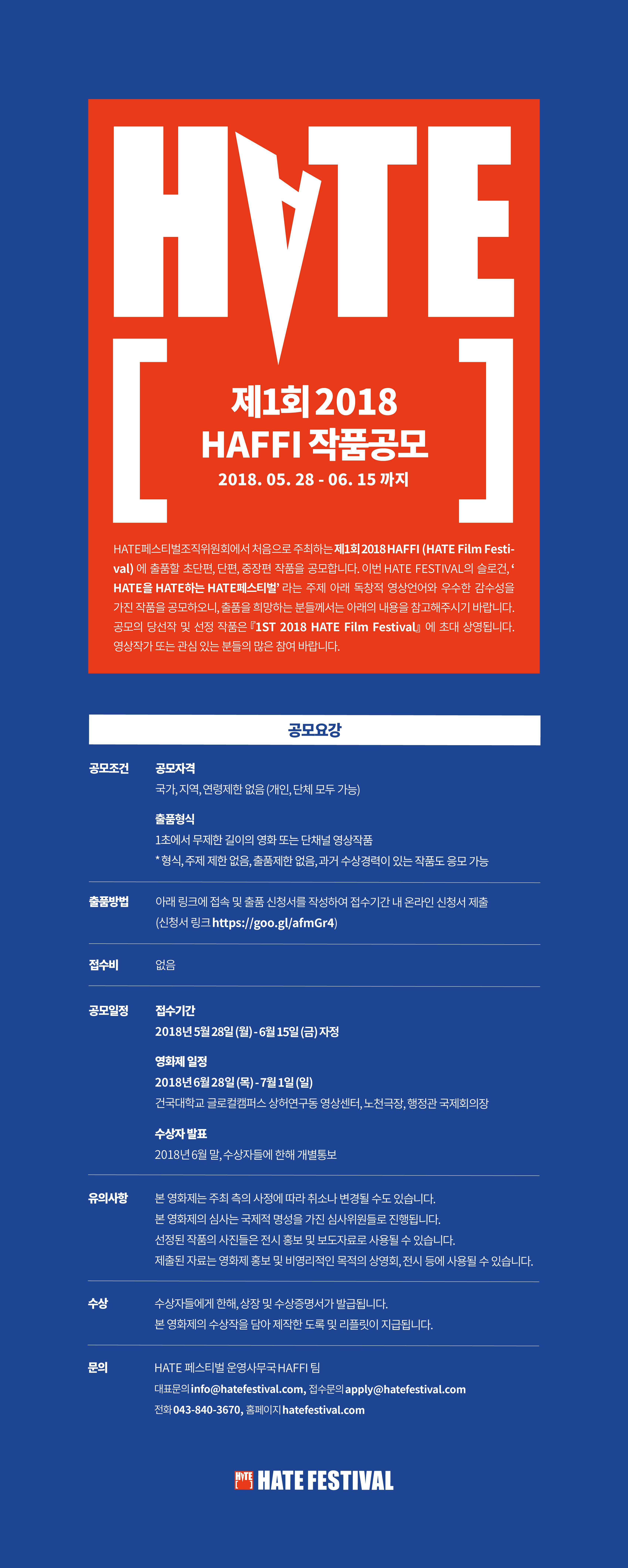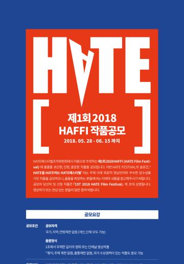 - HATE페스티벌조직위원회에서 처음으로 주최하는 제1회 HAFFI (HATE Film Festival) 에 출품할 초단편, 단편, 중장편 작품을 공모합니다. 이번 HATE FESTIVAL의 슬로건, ‘HATE을 HATE하는 HATE페스티벌’ 라는 주제 아래 독창적 영상언어와 우수한 감수성을 가진 작품을 공모하오니, 출품을 희망하는 분들께서는 아래의 내용을 참고해주시기 바랍니다. 공모의 당선작 및 선정 작품은 『2018 1ST HATE Film Festival』에 초대 상영됩니다. 영상작가 또는 관심 있는 분들의 많은 참여 바랍니다.