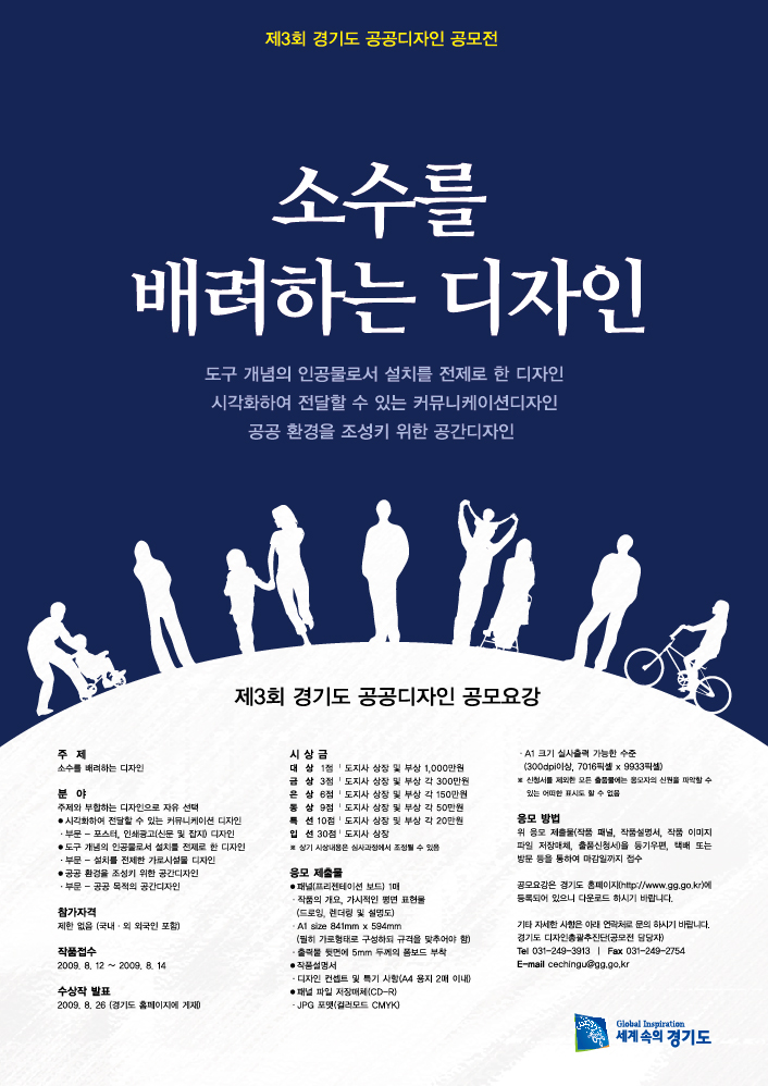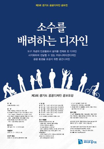 | 공공가치의 추구와 “소수를 배려하는 디자인”을 전제로 실질적인 사용자 중심의 공공디자인 실천방안을 모색하여 경기도와 부합하는 창의적인 디자인을 발굴 하고자 경기도 공공디자인 공모전을 개최하오니 많은 관심과 참여를 바랍니다. |
