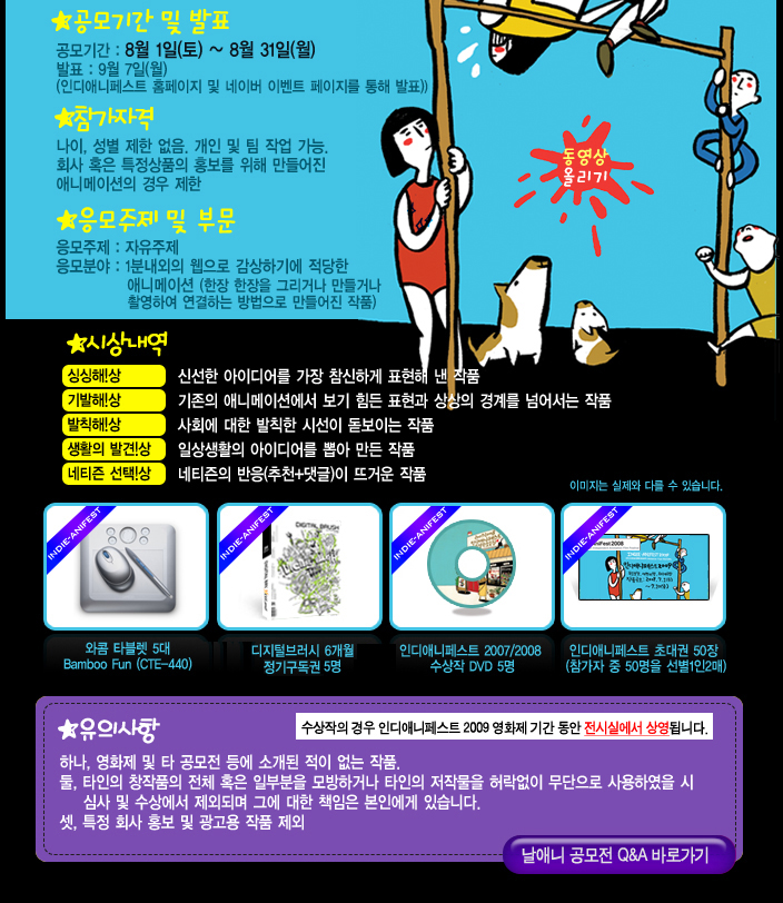 접수 기한: 2008년 8월 11일 ~9월 10일/네이버 날애니 공모전 페이지에 동영상 업로드