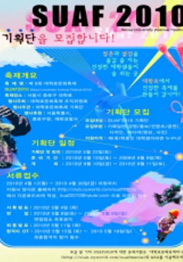 - 올해로 제 9회를 맞이하는 대학로 문화축제, SUAF2010의 기획단을 모집합니다.