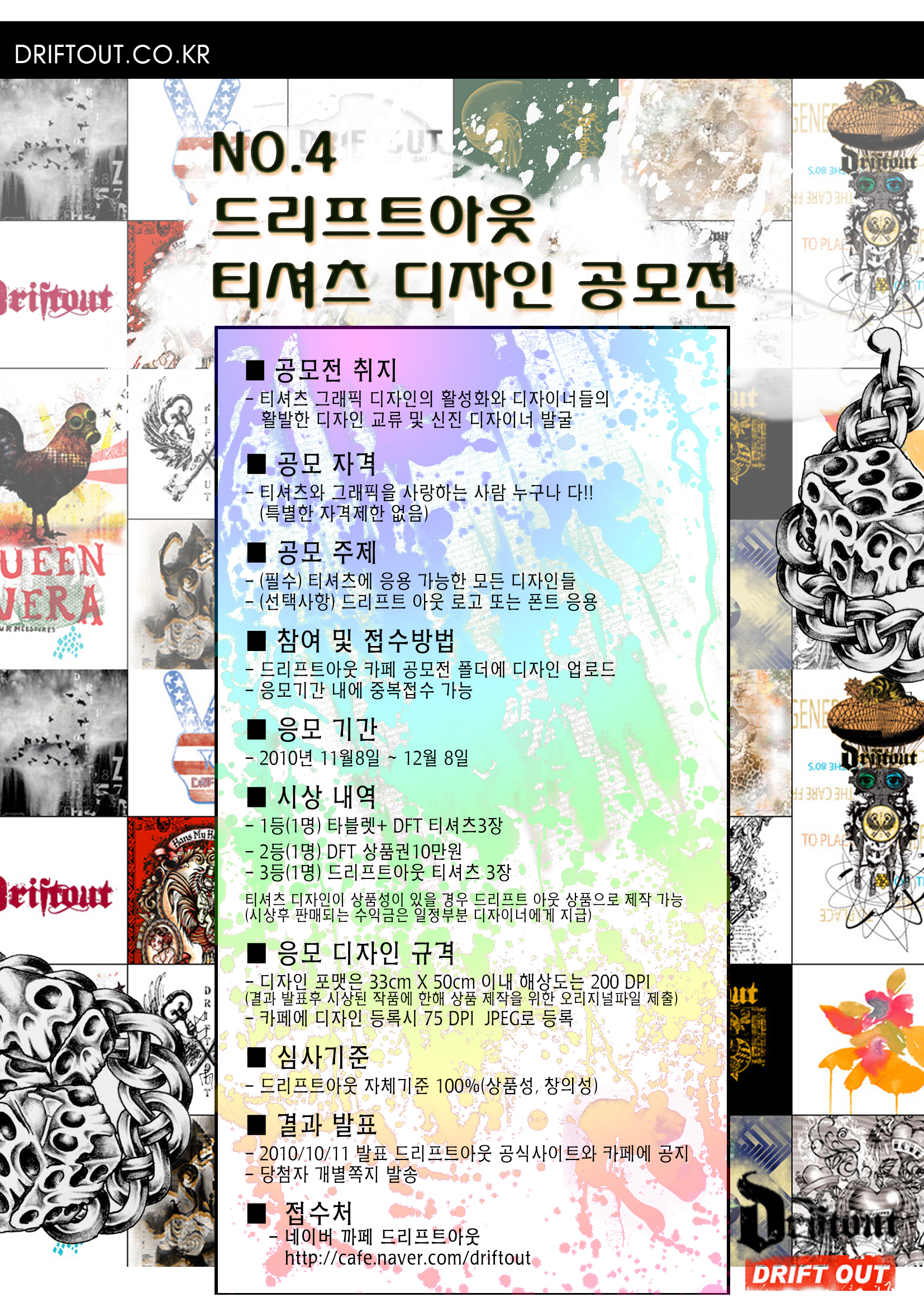 드리프트아웃에서 제4회 티셔츠 공모전을 개최합니다.티셔츠 그래픽과 티셔츠를 사랑하시는 모든분들의 많은 참여부탁드립니다.자세한 사항은 드리프트아웃 홈페이지와 네이버 드리프트아웃 까페 공지사항을 참고해주세요