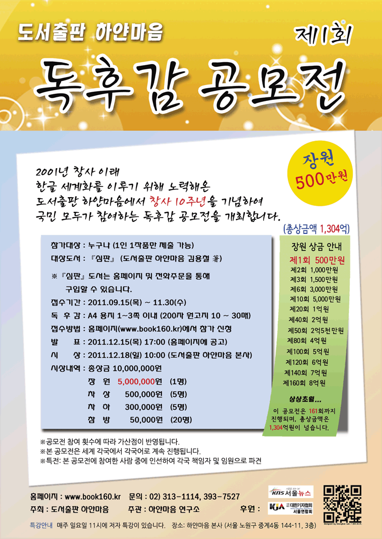 ●공모개요 : 도서출판 하얀마음 창사 10주년을 기념하여 제1회 독후감 공모전 개최