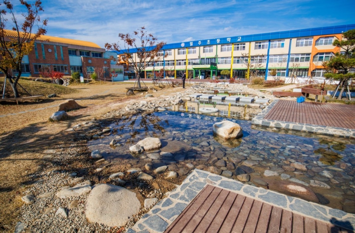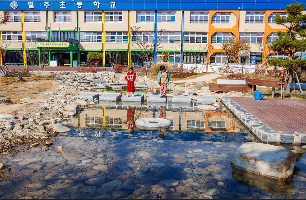 경남 밀양의 밀주초등학교는 운동장 혁신이 무엇을 바꿀 수 있는지 잘 보여주는 사례이다. 쇠락해가던 학교는 몇 년 전 운동장을 생태공간으로 전환하는 결단을 내렸다. 흙바닥 대신 작은 냇물이 흐르고, 물길 옆에는 풀과 나무가 자라며, 텃밭과 흙언덕, 작은 숲길이 새로운 운동장의 풍경을 만들었다.